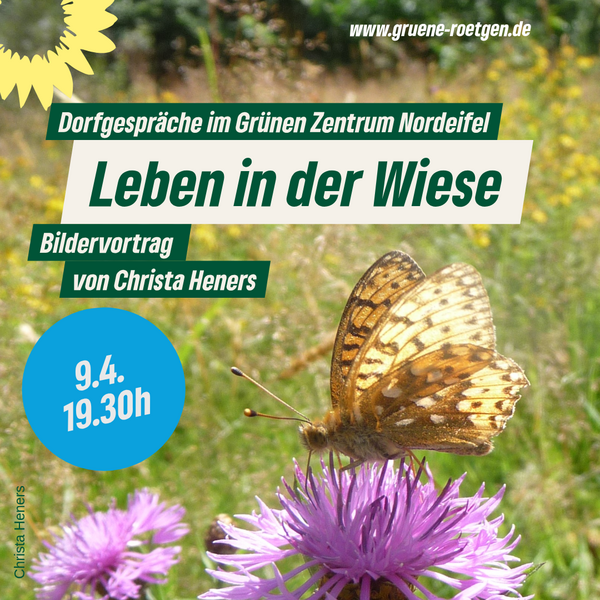 Einen kleinen Vorgeschmack auf den Sommer zeigt Christa Heners beim nächsten Dorfgespräch am 9. April im Grünen Zentrum Nordeifel. Bilder aus ihrem Naturgarten in Roetgen zeigen die lebendige Vielfalt in einer Wiese und machen Lust auf mehr. Es geht um Gräser und Blumen, Schmetterlinge, Libellen und viele andere Wiesenbewohner.